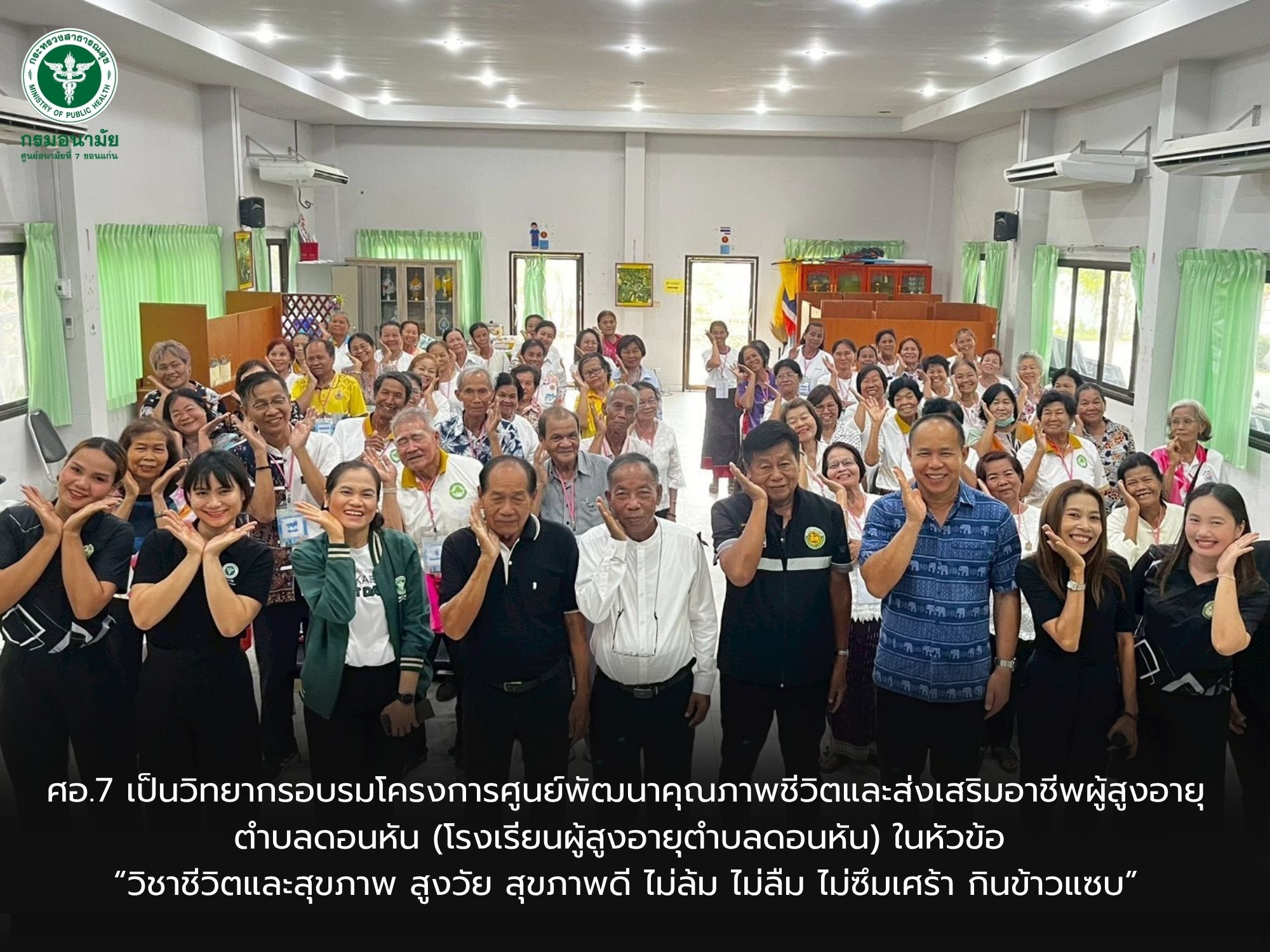 อ.7 เป็นวิทยากรอบรมโครงการศูนย์พัฒนาคุณภาพชีวิตและส่งเสริมอาชีพผู้สูงอายุตำบลดอนหัน (โรงเรียนผู้สูงอายุตำบลดอนหัน) ในหัวข้อ “วิชาชีวิตและสุขภาพ สูงวัย สุขภาพดี ไม่ล้ม ไม่ลืม ไม่ซึมเศร้า กินข้าวแซบ”