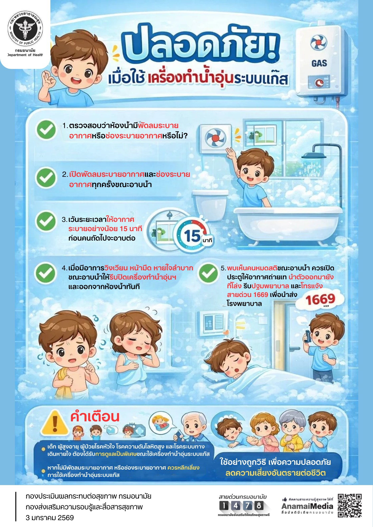 5. พบเห็นคนหมดสติขณะอาบน้ำ ควรเปิดประตูให้อากาศถ่ายเท นำตัวออกมายังที่โล่ง รีบปฐมพยาบาล และโทรแจ้ง สายด่วน 1669 เพื่อนำส่งโรงพยาบาล