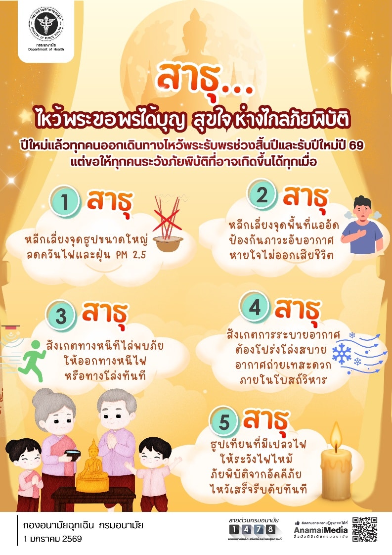 ช่วงปีใหม่ หลายคนออกเดินทางไปไหว้พระ รับพรส่งท้ายปีเก่า ต้อนรับปีใหม่ 2569 กรมอนามัยขอความห่วงใยด้านความปลอดภัย เพื่อให้การทำบุญเป็นช่วงเวลาที่อิ่มบุญ อิ่มใจ และปลอดภัยสำหรับทุกคน