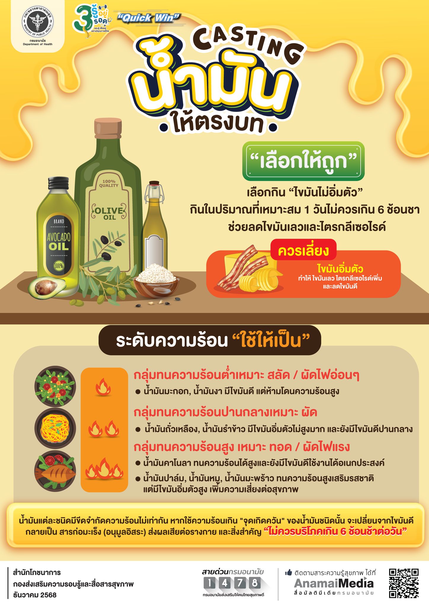 จะไก่ทอด เฟรนช์ฟรายส์ หรือเมนูปาร์ตี้สุดฟิน แค่เห็นก็น้ำลายสอแล้วใช่มั้ย? แต่เดี๋ยวก่อน! ก่อนจะหยิบเข้าปาก หรือเข้าครัวโชว์ฝีมือทำเลี้ยงเพื่อน กรมอนามัย อยากชวนทุกคนมาทำความรู้จัก "น้ำมัน" พระเอกคนสำคัญในกระทะกันก่อน ![]()