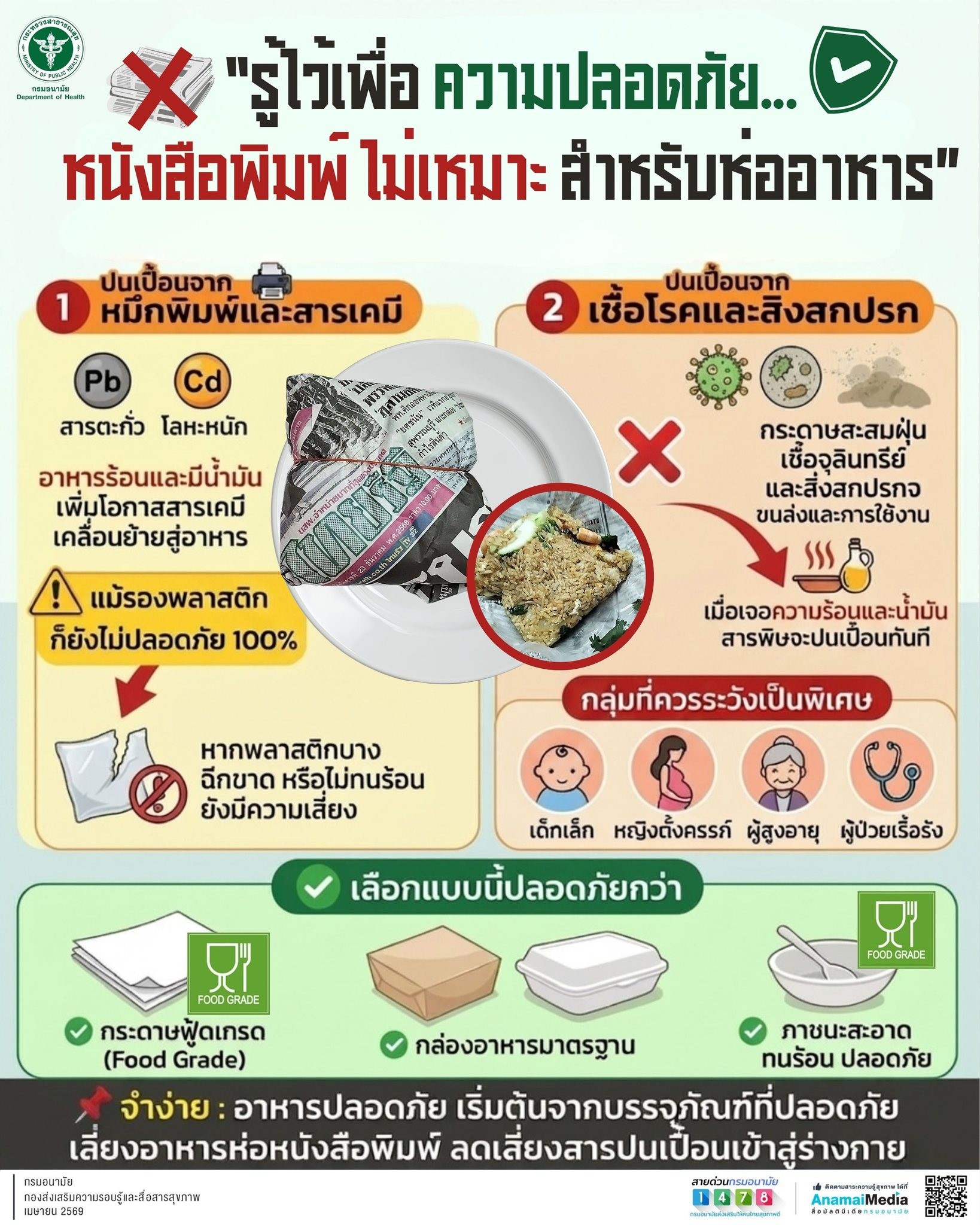 จำง่ายๆ : อาหารปลอดภัย เริ่มต้นจากบรรจุภัณฑ์ที่ปลอดภัย เลี่ยงอาหารห่อหนังสือพิมพ์ เพื่อลดความเสี่ยงสารปนเปื้อนเข้าสู่ร่างกาย
