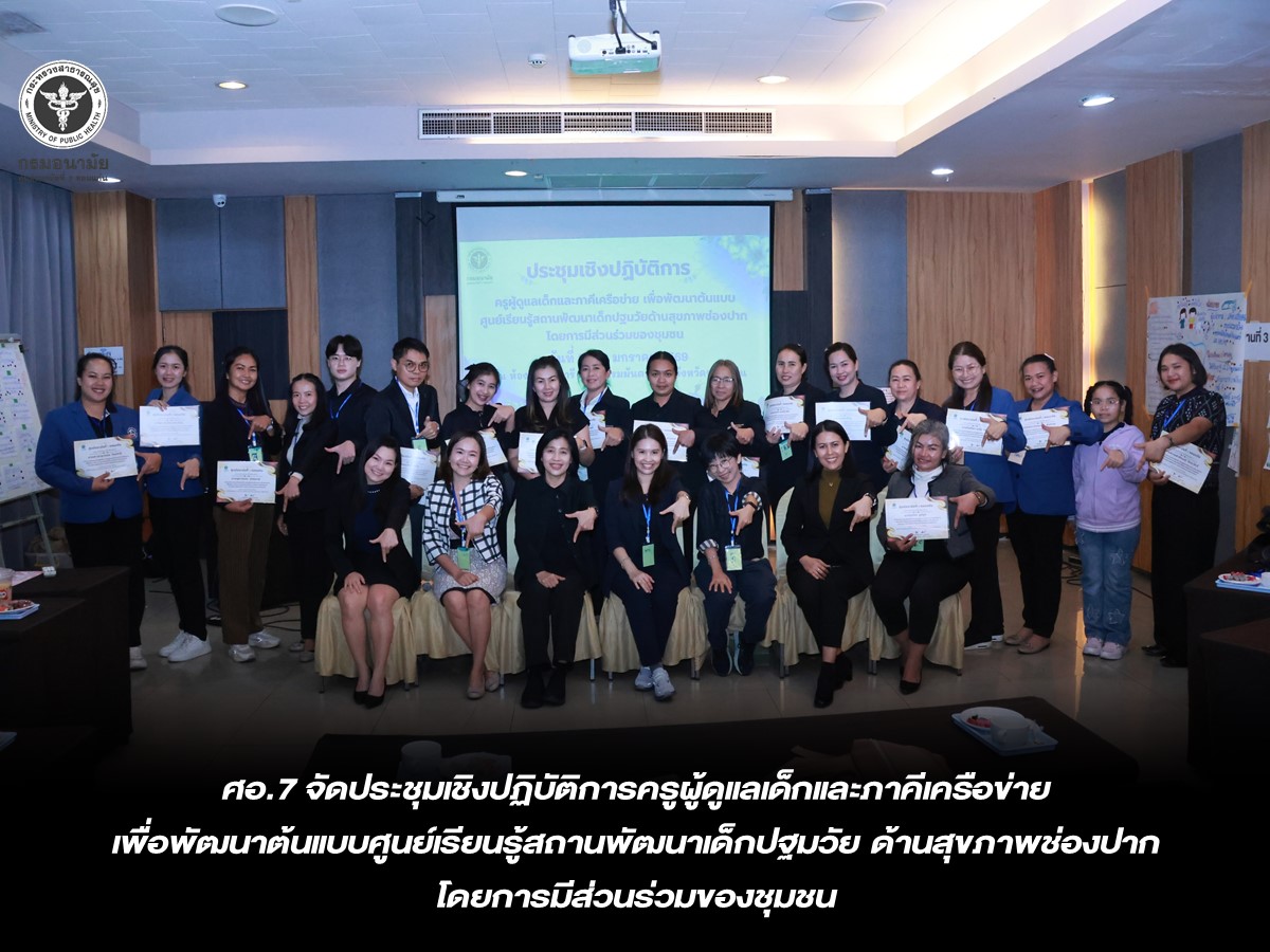 วันที่ 22-23 มกราคม 2569 ศูนย์อนามัยที่ 7 ขอนแก่น จัดประชุมเชิงปฏิบัติการครูผู้ดูแลเด็กและภาคีเครือข่าย เพื่อพัฒนาต้นแบบศูนย์เรียนรู้สถานพัฒนาเด็กปฐมวัย ด้านสุขภาพช่องปาก โดยการมีส่วนร่วมของชุมชน ณ ห้องประชุมมันตรา โรงแรมมันตราวารี อำเภอเมือง จังหวัดขอนแก่น เพื่อเสริมสร้างความรู้ ความเข้าใจ และทักษะในการส่งเสริมสุขภาพช่องปากเด็กปฐมวัย และถอดบทเรียนการดำเนินงานในพื้นที่ที่ประสบผลสำเร็จ รูปแบบการประชุมเป็นการบรรยาย และการแลกเปลี่ยนเรียนรู้ ผู้เข้าร่วมประชุมประกอบด้วย ครูผู้ดูแลเด็กในศูนย์พัฒนาเด็กปฐมวัย ทันตบุคลากร บุคลากรจากองค์กรปกครองส่วนท้องถิ่น ผู้ปกครอง ผู้อำนวยการโรงเรียน ครู และครูอนามัยโรงเรียน จำนวน 29 คน โดยได้รับการสนับสนุนวิทยากรจากคณะทันตแพทยศาสตร์ มหาวิทยาลัยสงขลานครินทร์ และโรงพยาบาลแม่ลาน จังหวัดปัตตานี