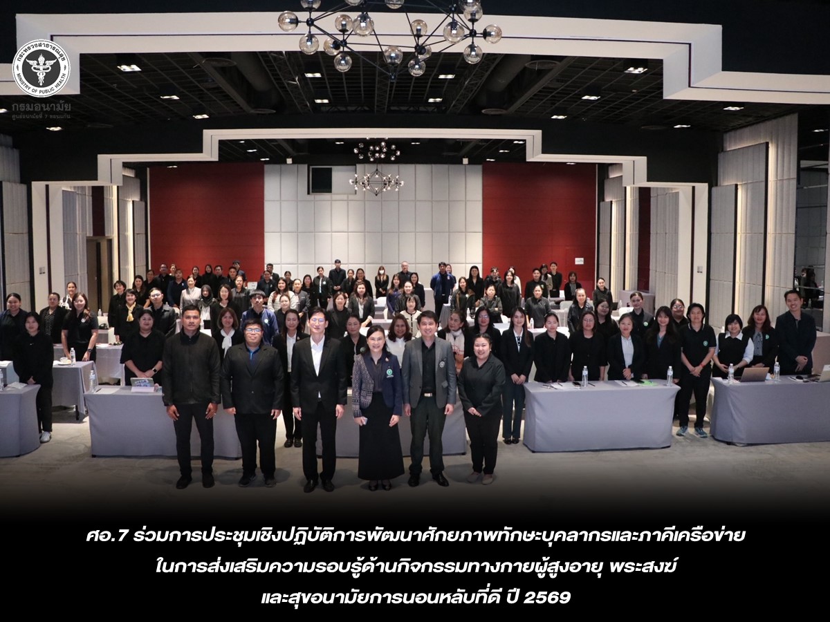 วันที่ 21 - 23 มกราคม 2569 นายแพทย์ชาตรี เมธาธราธิป ผู้อำนวยการศูนย์อนามัยที่ 7 ขอนแก่น มอบหมายให้ กลุ่มพัฒนาการส่งเสริมสุขภาพวัยสูงอายุ ศูนย์อนามัยที่ 7 ขอนแก่น ร่วมการประชุมเชิงปฏิบัติการพัฒนาศักยภาพทักษะบุคลากรและภาคีเครือข่ายในการส่งเสริมความรอบรู้ด้านกิจกรรมทางกายผู้สูงอายุ พระสงฆ์ และสุขอนามัยการนอนหลับที่ดี ปี 2569 เพื่อเตรียมความพร้อมรองรับสังคมสูงวัยอย่างมีคุณภาพ โดยมี แพทย์หญิงนงนุช ภัทรอนันตนพ รองอธิบดีกรมอนามัย เป็นประธานเปิดการอบรมฯ ณ ห้องประชุมพีโอนี โรงแรมทีเค พาเลซ แอนด์ คอนเวนชั่น กรุงเทพมหานคร ผู้เข้าร่วมประกอบด้วยตัวแทนจากสาธารณสุขจังหวัด ศูนย์อนามัยที่ 1- 12 สถาบันสุขภาวะเขตเมือง และเจ้าหน้าที่จากกรมอนามัย เนื้อหาการอบรมประกอบไปด้วย การมีกิจกรรมทางกายในผู้สูงอายุที่มีภาวะมวลกล้ามเนื้อน้อยและเปราะบาง การประเมินสมรรถภาพทางกายสำหรับผู้สูงอายุ การมีกิจกรรมทางกายสำหรับพระสงฆ์ สุขอนามัยการนอนหลับที่ดี และการออกกำลังกายเพื่อป้องกันและบำบัดโรค NCDs