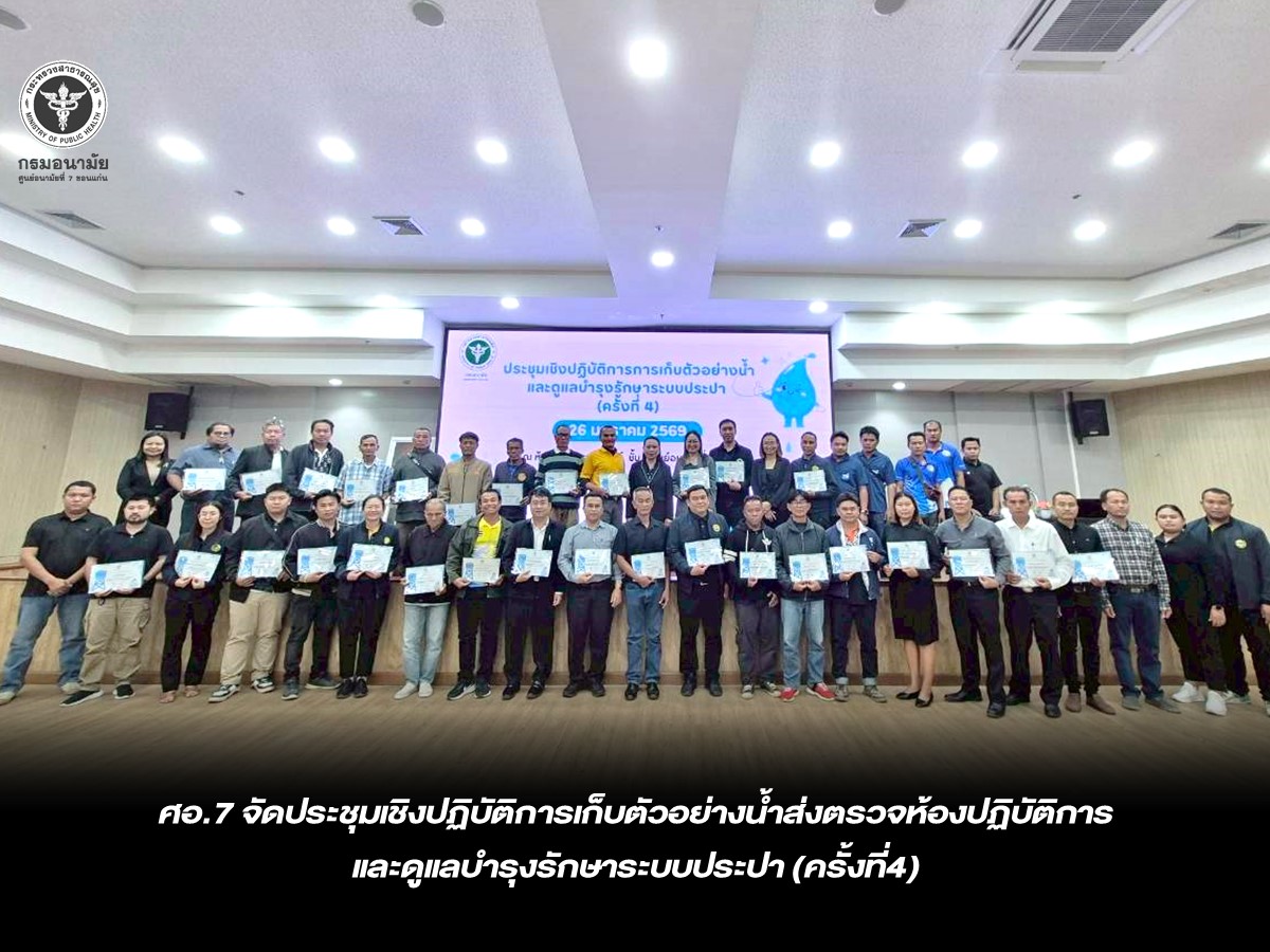 วันที่ 26 มกราคม 2569 นพ.ชาตรี เมธาธราธิป ผู้อำนวยการศูนย์อนามัยที่ 7 ขอนเเก่น มอบหมายให้กลุ่มพัฒนาอนามัยสิ่งเเวดล้อม จัดประชุมเชิงปฏิบัติการเก็บตัวอย่างน้ำส่งตรวจห้องปฏิบัติการ เเละดูเเลบำรุงรักษาระบบประปา (ครั้งที่4) ณ ห้องประชุมราชพฤกษ์ ศูนย์อนามัยที่ 7 ขอนเเก่น โดยมี นายสุวิศิษฎ์ ช่างทอง หัวหน้ากลุ่มพัฒนาอนามัยสิ่งเเวดล้อม เป็นประธานเปิดการประชุม เพื่อส่งเสริมให้องค์กรปกครองส่วนท้องถิ่นเเละคณะกรรมการประปาหมู่บ้าน เห็นความสำคัญของการเติมคลอรีนเพื่อฆ่าเชื้อโรคในน้ำ พัฒนาศักยภาพผู้ดูเเลระบบประปาให้สามารถบริหารจัดการ ดูเเลบำรุงรักษาสถานีผลิตประปาที่มีอายุการใช้งานนานกว่า 20 ปี ให้มีสภาพพร้อมใช้งาน ตามเเนวทาง 3C : Clear Clean Chlorine พร้อมทั้งชี้เเจงเเผนการเก็บตัวอย่างน้ำส่งตรวจห้องปฏิบัติการ ปีงบประมาณ 2569 มีกิจกรรมฝึกปฎิบัติการเก็บตัวอย่างน้ำส่งตรวจห้องปฏิบัติการ ทดสอบการตรวจคลอรีนอิสระคงเหลือในน้ำ ใช้เครื่องมือตรวจคุณภาพน้ำดิบก่อนเข้าระบบ เช่น ชุดทดสอบกรด-ด่าง เครื่องวัดความขุ่น เป็นต้น