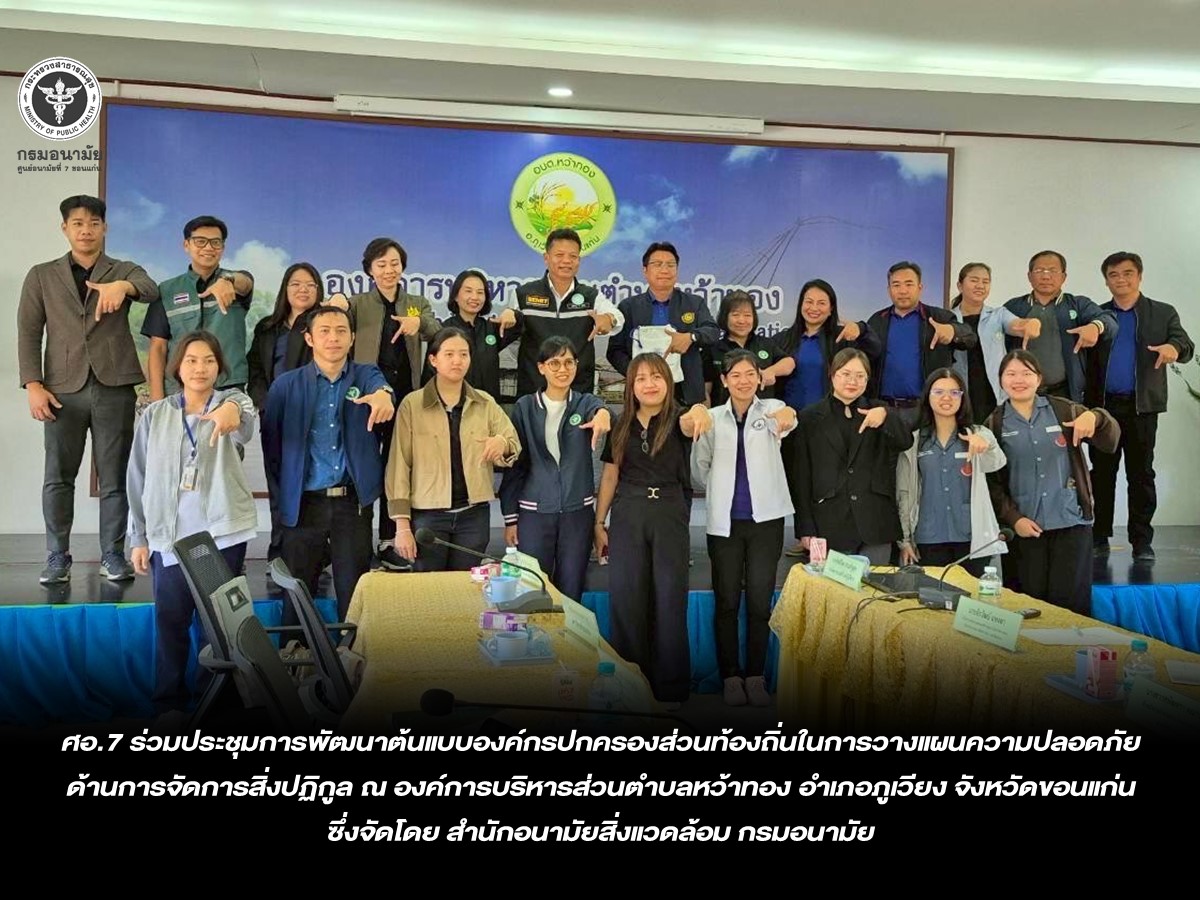 วันที่ 3 กุมภาพันธ์ 2569 นายแพทย์ชาตรี เมธาธราธิป ผู้อำนวยการศูนย์อนามัยที่ 7 ขอนแก่น มอบหมายนายสุวิศิษฎ์ ช่างทอง นักวิชาการสาธารณสุขชำนาญการพิเศษ พร้อมด้วยเจ้าหน้าที่กลุ่มพัฒนาอนามัยสิ่งแวดล้อม ร่วมประชุมการพัฒนาต้นแบบองค์กรปกครองส่วนท้องถิ่นในการวางแผนความปลอดภัยด้านการจัดการสิ่งปฏิกูล ณ องค์การบริหารส่วนตำบลหว้าทอง อำเภอภูเวียง จังหวัดขอนแก่น ซึ่งจัดโดย สำนักอนามัยสิ่งแวดล้อม กรมอนามัย และการประชุมได้รับเกียรติจาก นายสถาพร โสภา ปลัดองค์การบริหารส่วนตำบล ปฏิบัติหน้าที่ นายกองค์การบริหารส่วนตำบลหว้าทอง กล่าวต้อนรับคณะผู้เข้าร่วมประชุม รวมจำนวน 30 คน ซึ่งเป็นผู้แทนจากหน่วยงานต่างๆ ได้แก่ ศูนย์อนามัยที่ 7 ขอนแก่น สำนักงานสาธารณสุขจังหวัดขอนแก่น สำนักงานสาธารณสุขอำเภอภูเวียง เกษตรอำเภอภูเวียง รพ.สต.หว้าทอง คณะสาธารณสุขศาสตร์ มหาวิทยาลัยขอนแก่น สำนักงานทรัพยากรธรรมชาติและสิ่งแวดล้อมจังหวัดขอนแก่น คณะผู้บริหารเจ้าหน้าที่องค์การบริหารส่วนตำบลหว้าทอง โดยการประชุมครั้งนี้ วัตถุประสงค์เพื่อชี้แจงแนวทางการวางแผนความปลอดภัยด้านการจัดการสิ่งปฏิกูล (Sanitation safety planning : SSP) และกระบวนการจัดประชุมเชิงปฏิบัติการวางแผนความปลอดภัยด้านการจัดการสิ่งปฏิกูลขององค์กรปกครองส่วนท้องถิ่น รับทราบสถานการณ์การจัดการสิ่งปฏิกูลของประเทศ และในพื้นที่เขตสุขภาพที่ 7 แลกเปลี่ยนข้อมูล ข้อเสนอแนะต่อการขับเคลื่อนการดำเนินงานในพื้นที่ และลงพื้นที่ศึกษาระบบบำบัดสิ่งปฏิกูลขององค์การบริหารส่วนตำบลหว้าทอง อำเภอภูเวียง จังหวัดขอนแก่น