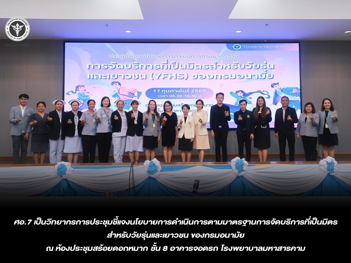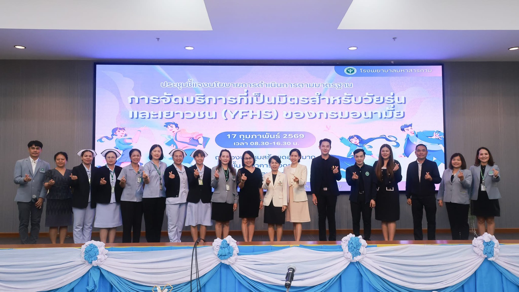 วันที่ 17 กุมภาพันธ์ 2569 กลุ่มพัฒนาการส่งเสริมสุขภาพวัยรุ่น ศูนย์อนามัยที่ 7 ขอนแก่น นำโดย นางชนิตา รุ่งวิทยาการ หัวหน้ากลุ่มพัฒนาการส่งเสริมสุขภาพวัยรุ่น และทีมงานร่วมเป็นวิทยากรในการประชุมชี้แจงนโยบายการดำเนินการตามมาตรฐานการจัดบริการที่เป็นมิตรสำหรับวัยรุ่นและเยาวชน (Youth Friendly Health Services: YFHS) ของกรมอนามัย เพื่อสร้างความเข้าใจในทิศทางการดำเนินงานและพัฒนาระบบบริการสุขภาพให้เข้าถึงหัวใจของวัยรุ่นอย่างแท้จริง ณ ห้องประชุมสร้อยดอกหมาก ชั้น 8 อาคารจอดรถ โรงพยาบาลมหาสารคาม การประชุมในครั้งนี้ได้รับเกียรติจาก แพทย์หญิงจรัญญา จุฬารี รองผู้อำนวยการด้านบริการปฐมภูมิ โรงพยาบาลมหาสารคาม เป็นประธานในพิธีเปิด โดยมี นางวิศรุดา ตีเมืองซ้าย หัวหน้างานส่งเสริมสุขภาพและฟื้นฟู เป็นผู้กล่าวรายงาน การประชุมชี้แจงครั้งนี้ได้บรรยายเรื่องทิศทางและนโยบาย สถานการณ์ และตัวชี้วัดด้านอนามัยการเจริญพันธุ์ มาตรฐานการจัดบริการที่เป็นมิตรสำหรับวัยรุ่นและเยาวชน ฉบับ พ.ศ.2563 ผู้เข้าร่วมประชุม จำนวน 100 คน