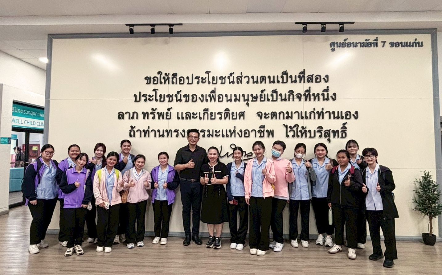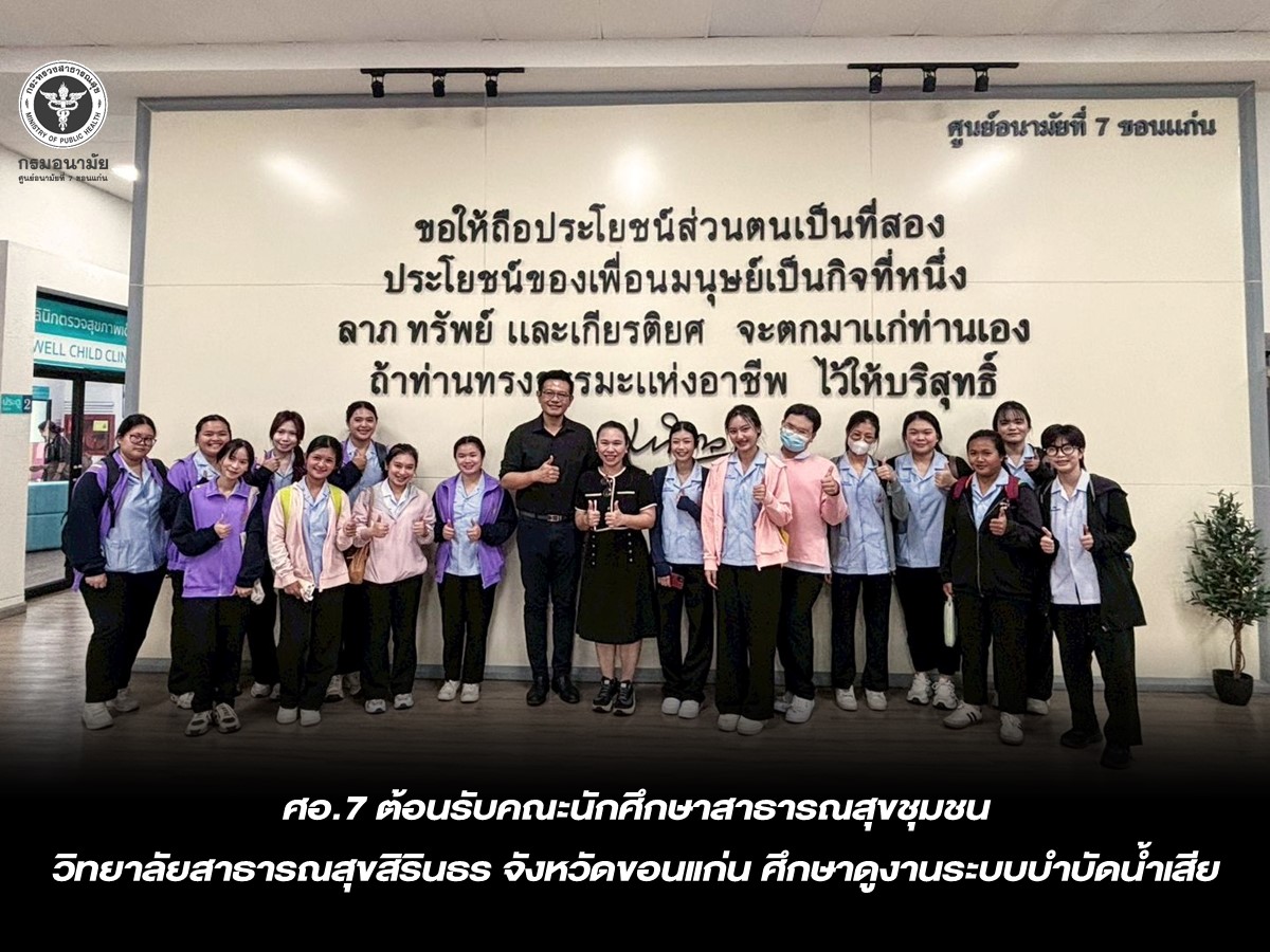 วันที่ 19 กุมภาพันธ์ 2569 นายแพทย์ชาตรี เมธาธราธิป ผู้อำนวยการศูนย์อนามัยที่ 7 ขอนแก่น มอบหมายให้นายสุวิศิษฏ์ ช่างทอง หัวหน้ากลุ่มพัฒนาอนามัยสิ่งแวดล้อม และนางลักขณา ถาปาบุตร หัวหน้ากลุ่มอำนวยการและเจ้าหน้าที่ ร่วมต้อนรับคณะศึกษาดูงานจากนักศึกษาชั้นปีที่ 3 สาขาวิชาสาธารณสุขชุมชน วิทยาลัยสาธารณสุขสิรินธร จังหวัดขอนแก่น นำโดย อาจารย์ ดร.บัณฑิต นิตย์คำหาญ และมอบหมายให้นางสาวนิติยาภรณ์ ศรีชัย รองหัวหน้ากลุ่มพัฒนาอนามัยสิ่งแวดล้อมเป็นวิทยากรบรรยาย หัวข้อ การบริหารจัดการระบบบำบัดน้ำเสีย ศูนย์อนามัยที่ 7 ขอนแก่น และลงพื้นที่ศึกษาดูงานระบบบำบัดน้ำเสีย ศุนย์อนามัยที่ 7 ขอนแก่น แบบถังเกรอะ-กรองไร้อากาศ (Septic Anaerobic Filter) ร่วมกับการเติมอากาศในหน่วยบำบัดสุดท้าย (Post Aerated Tank) ซึ่งมีการเฝ้าระวังคุณภาพน้ำทิ้ง 4 ครั้ง/ปี