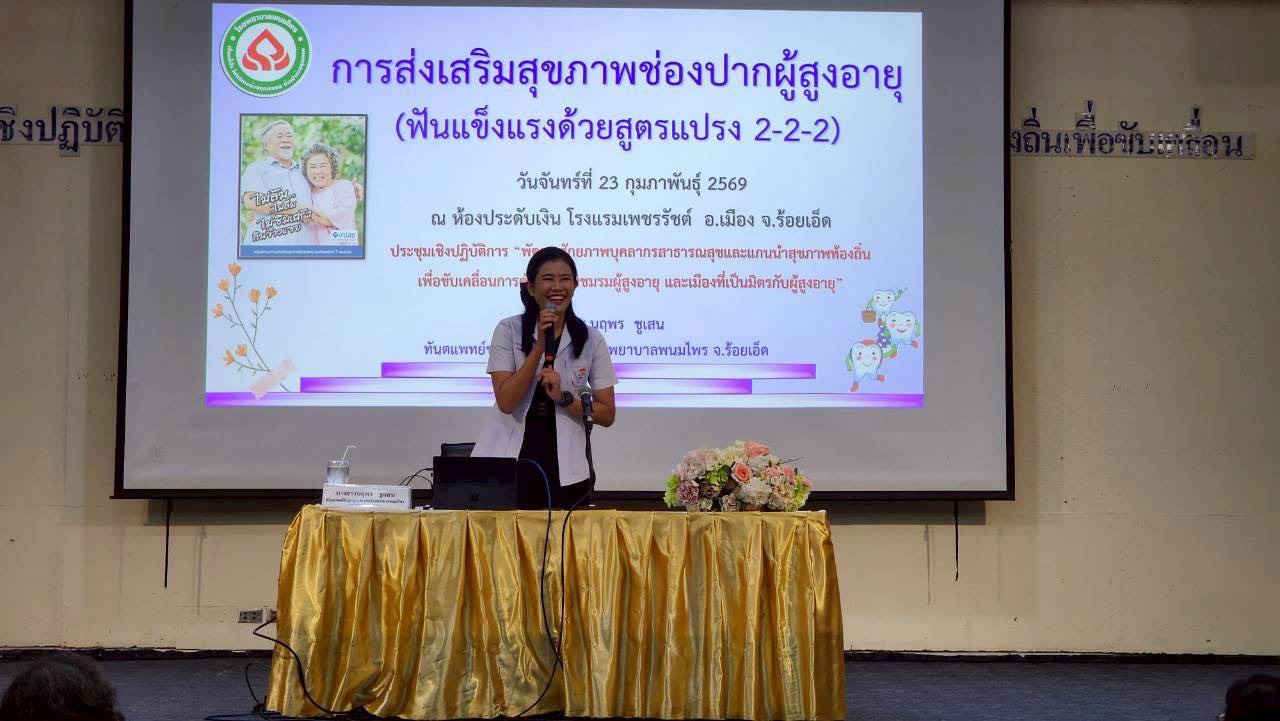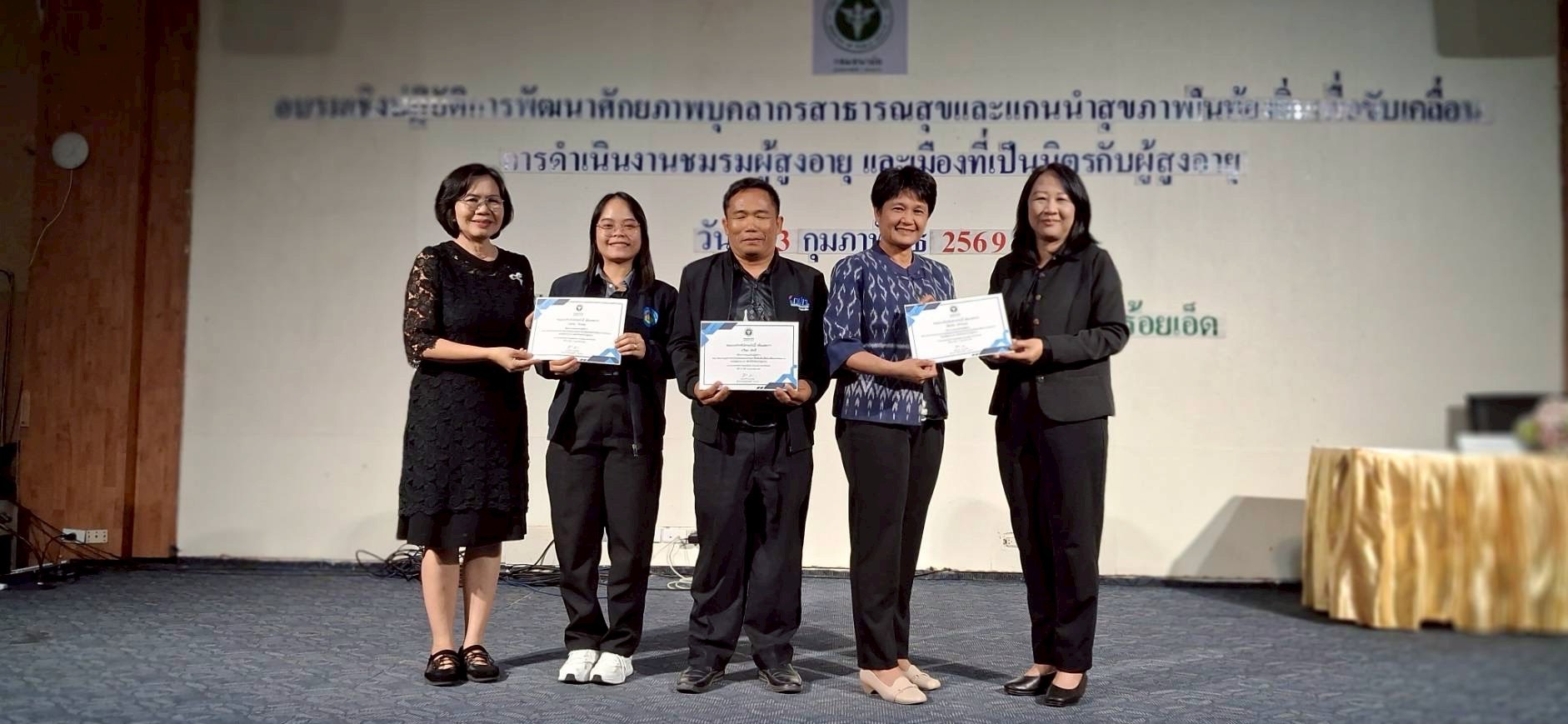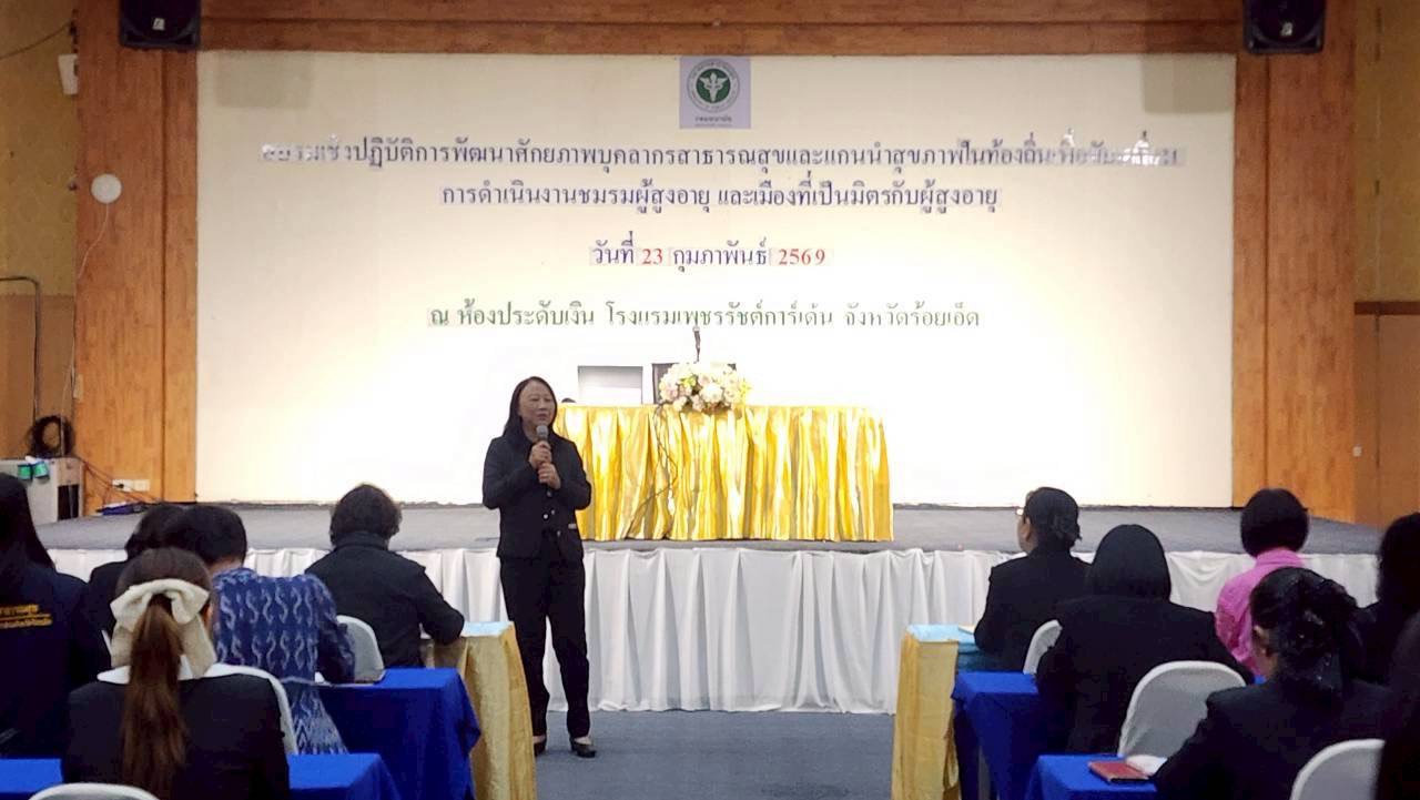 วันที่ 23 กุมภาพันธ์ 2569 นพ.ชาตรี เมธาธราธิป ผู้อำนวยการศูนย์อนามัยที่ 7 ขอนแก่น มอบหมายให้ กลุ่มพัฒนาการส่งเสริมสุขภาพวัยสูงอายุ ศูนย์อนามัยที่ 7 ขอนแก่น ร่วมกับสำนักงานสาธารณสุขจังหวัดร้อยเอ็ด จัดอบรมเชิงปฏิบัติการพัฒนาศักยภาพบุคลากรสาธารณสุขและแกนนำสุขภาพในท้องถิ่นเพื่อขับเคลื่อนการดำเนินงานชมรมผู้สูงอายุ และเมืองที่เป็นมิตรกับผู้สูงอายุ ณ โรงแรมเพชรรัตน์ ต.เหนือเมือง อ.เมือง จ.ร้อยเอ็ด ผู้เข้าร่วมอบรมประกอบด้วย เจ้าหน้าที่ผู้รับผิดชอบงานผู้สูงอายุจาก อบจ./อปท./หน่วยบริการสาธารณสุข และแกนนำสุขภาพจากโรงเรียน/ชมรมผู้สูงอายุ จำนวน 91 คน โดยมี ดร.สดุดี ภูห้องไสย หัวหน้ากลุ่มพัฒนาการส่งเสริมสุขภาพวัยสูงอายุ ศูนย์อนามัยที่ 7 ขอนแก่น และ นางปิยมณฑ์ พฤกษชาติ หัวหน้ากลุ่มส่งเสริมสุขภาพ สำนักงานสาธารณสุขจังหวัดร้อยเอ็ด กล่าวต้อนรับผู้เข้าอบรม