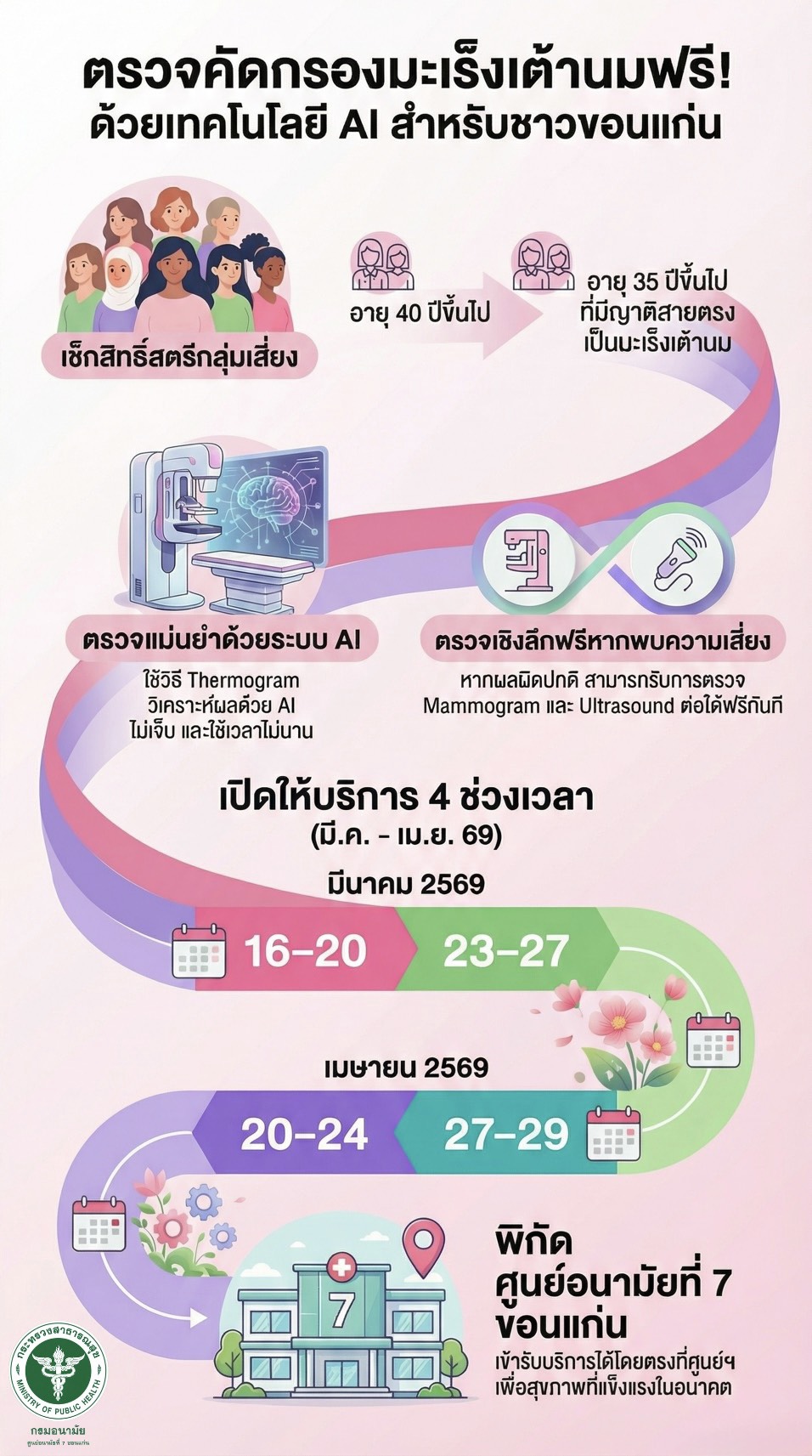 ทั้งนี้ ศูนย์อนามัยที่ 7 ขอนแก่น ได้ประชาสัมพันธ์โครงการตรวจคัดกรองมะเร็งเต้านมด้วย เทคโนโลยี Thermogram & AI ที่จะมีขึ้นช่วงวันที่ 16 มีนาคม - 29 เมษายน 2569 พร้อมแนวทางการติดต่อสำหรับผู้สนใจเพื่อขยายผลการส่งเสริมสุขภาพอย่างต่อเนื่องต่อไป