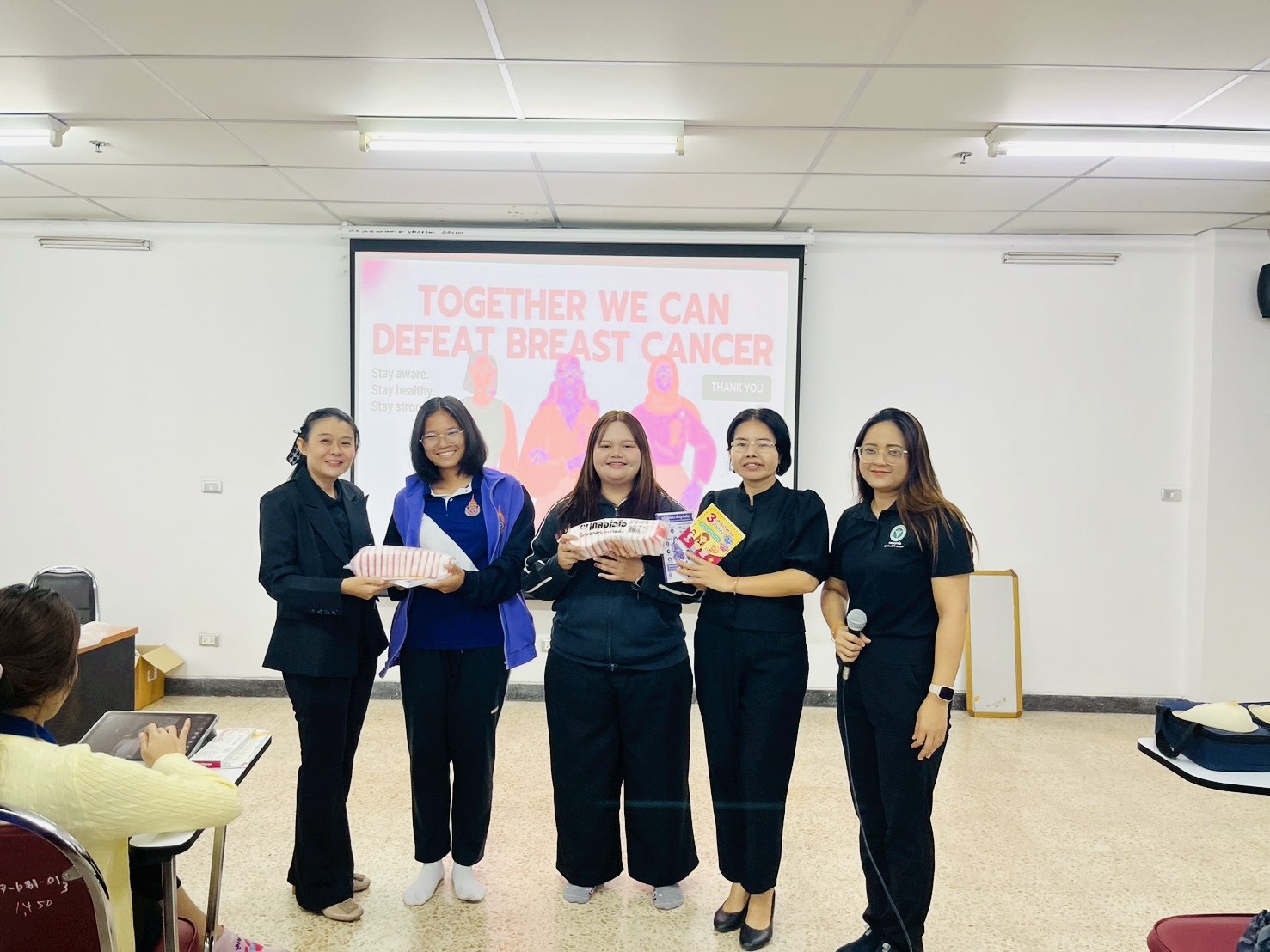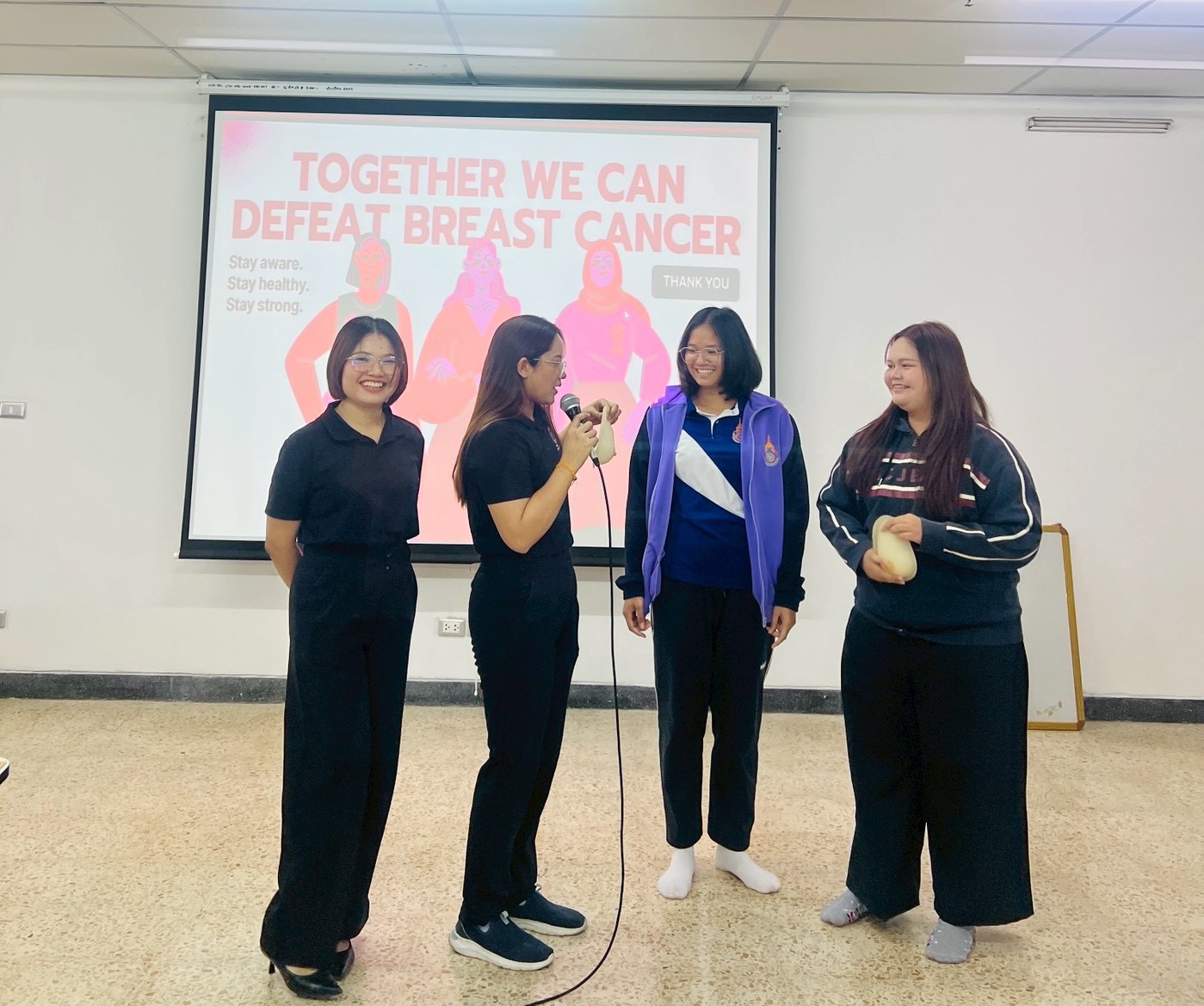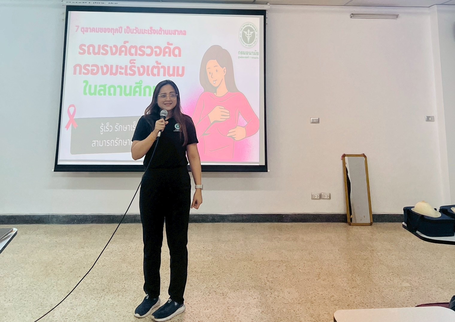 กิจกรรมประกอบด้วย การบรรยายให้ความรู้เรื่องโรคมะเร็งเต้านม การตรวจเต้านมด้วยตนเอง และเชิญชวนสร้างแกนนำในสถานศึกษา โดยได้รับความร่วมมืออย่างดียิ่งจาก ผู้ช่วยศาสตราจารย์ ดร.เทพไทย โชติชัย หัวหน้าสาขาวิชาสาธารณสุขชุมชน และอาจารย์ ดร.อนุวัตน์ เพ็งพุฒ ในการสนับสนุนกิจกรรม