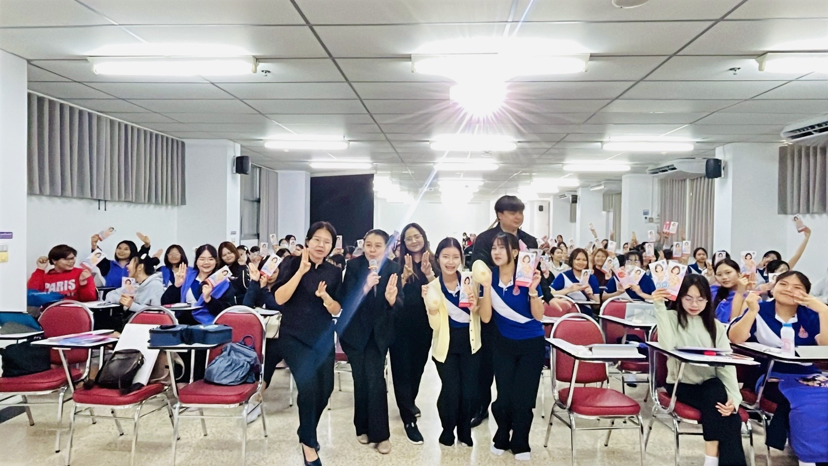 วันที่ 24 กุมภาพันธ์ 2569 กลุ่มพัฒนาการส่งเสริมสุขภาพวัยทำงาน ศูนย์อนามัยที่ 7 ขอนแก่น จัดกิจกรรมรณรงค์สร้างความรอบรู้ ภายใต้โครงการส่งเสริมสุขภาพตามแนวทางโครงการพระราชดำริและเฉลิมพระเกียรติ เขตสุขภาพที่ 7 ประจำปีงบประมาณ พ.ศ. 2569 เพื่อขับเคลื่อนการดำเนินงานด้านการส่งเสริมสุขภาพโดยการเสริมสร้างความรอบรู้ การตรวจคัดกรองมะเร็งเต้านมด้วยตนเอง ณ ห้องประชุมอาคาร 9 วิทยาลัยการสาธารณสุขสิรินธร อำเภอเมือง จังหวัดขอนแก่น มีเจ้าหน้าที่สาธารณสุข นักศึกษา และผู้สนใจเข้าร่วมรวม 120 คน