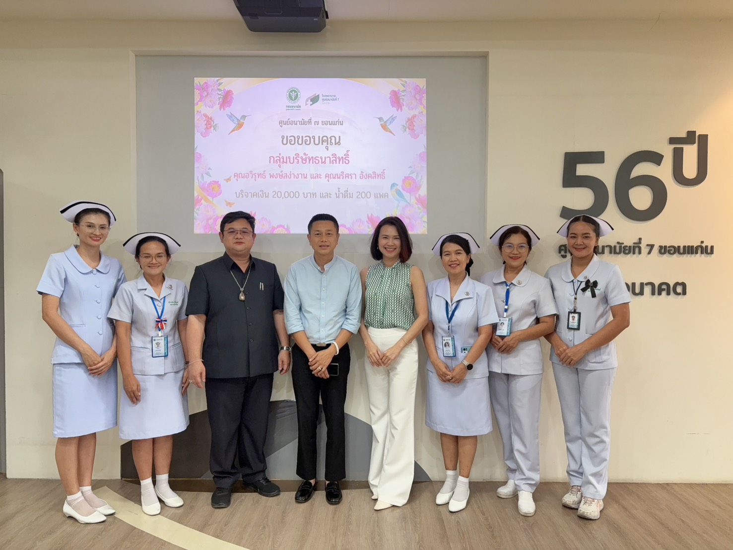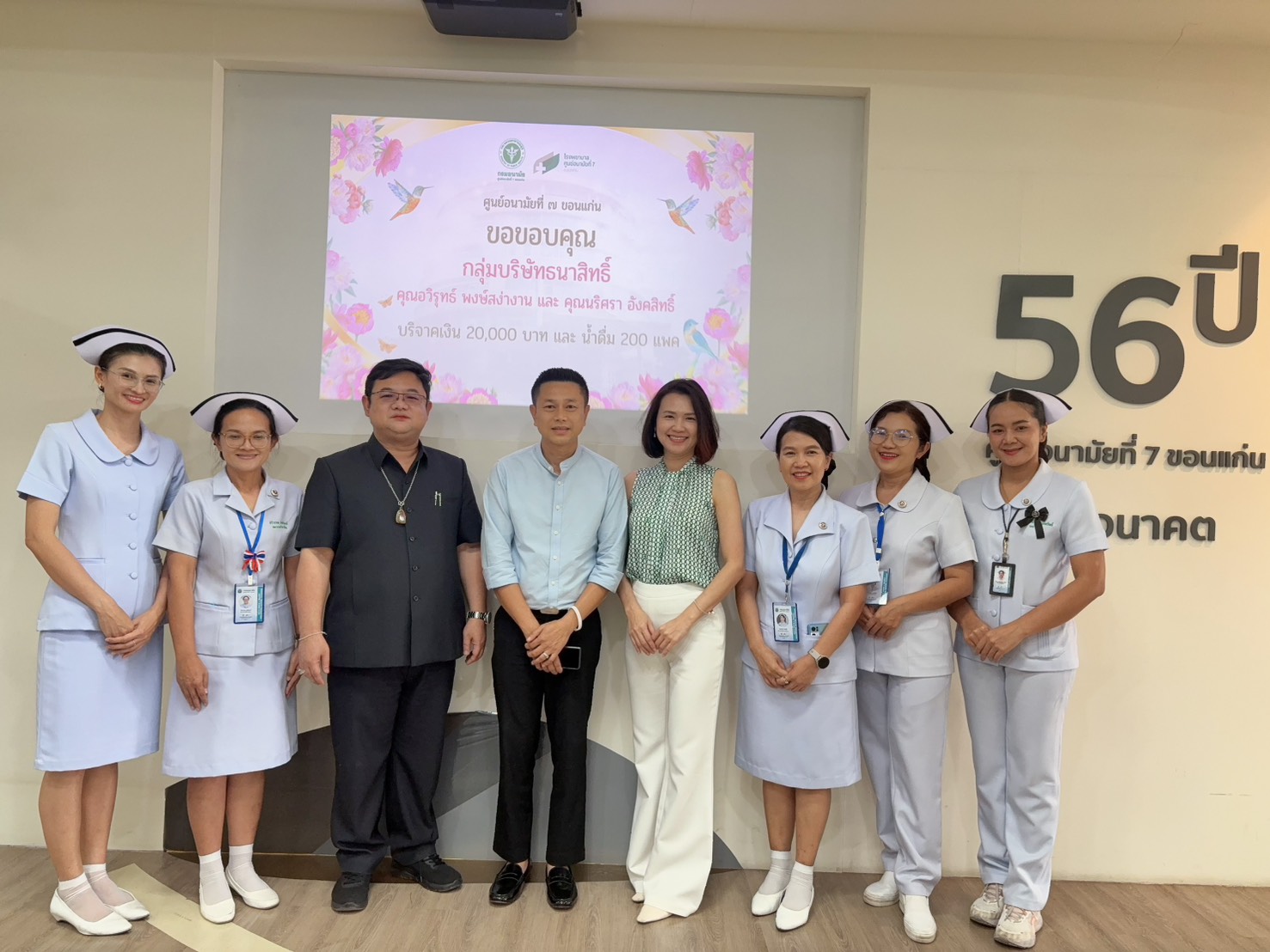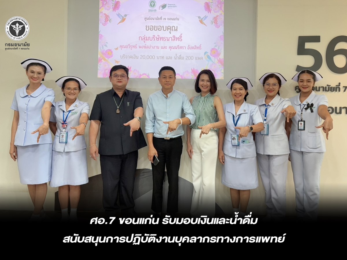 วันที่ 24 กุมภาพันธ์ 2569 ศูนย์อนามัยที่ 7 ขอนแก่น ขอขอบคุณกลุ่มบริษัทธนาสิทธิ์ พร้อมด้วยคุณอวิรุทธ์ พงษ์สง่างาน และคุณนริศรา อังคสิทธิ์ ที่ได้บริจาคเงินจำนวน 20,000 บาท และน้ำดื่ม จำนวน 200 แพ็ค ให้แก่โรงพยาบาลศูนย์อนามัยที่ 7 ขอนแก่น เพื่อสนับสนุนการปฏิบัติงานของบุคลากรทางการแพทย์ ในการนี้ นพ.ชาตรี เมธาธราธิป ผู้อำนวยการศูนย์อนามัยที่ 7 ขอนแก่น มอบหมายให้ ดร.อธิวัฒน์ บุตรดาบุตร รองผู้อำนวยการศูนย์อนามัยที่ 7 ขอนแก่น (ด้านบริหาร) พร้อมคณะเจ้าหน้าที่ เป็นผู้รับมอบ เพื่อเสริมสร้างขวัญกำลังใจและสนับสนุนการดำเนินงานด้านบริการสุขภาพแก่ประชาชน