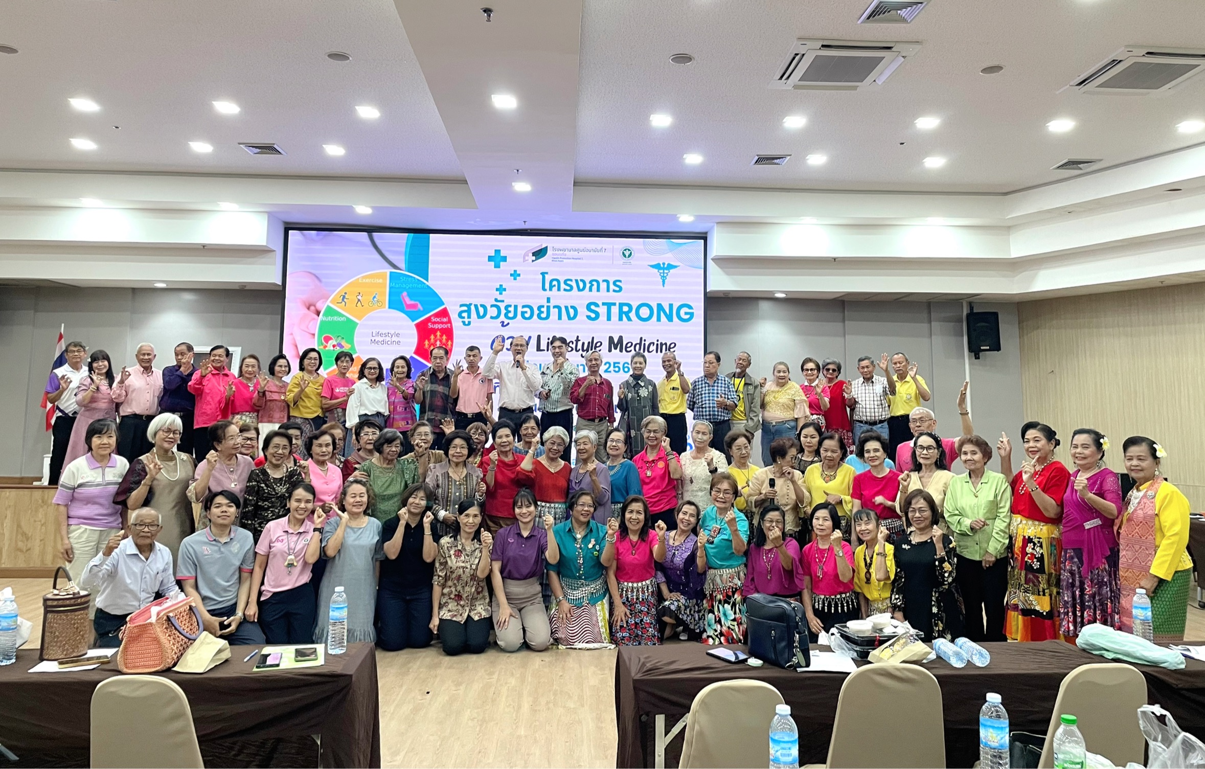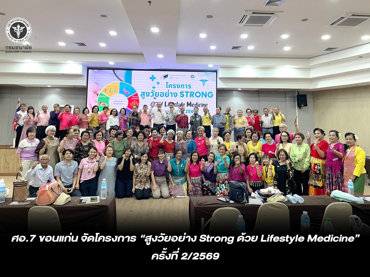 วันที่ 24 กุมภาพันธ์ 2569 นายแพทย์ชาตรี เมธาธราธิป ผู้อำนวยการศูนย์อนามัยที่ 7 ขอนแก่น มอบหมายให้คลินิกส่งเสริมสุขภาพผู้สูงอายุ ร่วมกับ กลุ่มพัฒนาการส่งเสริมสุขภาพวัยสูงอายุ ศูนย์อนามัยที่ 7 ขอนแก่น จัดโครงการ “สูงวัยอย่าง Strong ด้วย Lifestyle Medicine” ครั้งที่ 2/2569 เพื่อส่งเสริมความรอบรู้ด้านสุขภาพตามหลักเวชศาสตร์วิถีชีวิตในผู้สูงอายุ ให้มีความรู้ที่ถูกต้องเกี่ยวกับการดูแลสุขภาพด้วยตนเองสามารถนำหลักเวชศาสตร์วิถีชีวิตไปปรับใช้ในชีวิตประจำวันได้อย่างเป็นรูปธรรม และเพื่อเพิ่มความแข็งแกร่งของร่างกายและสร้างสุขภาวะทางจิตที่ดี ลดภาวะซึมเศร้าและความโดดเดี่ยวในผู้สูงอายุผ่านกิจกรรมกลุ่ม