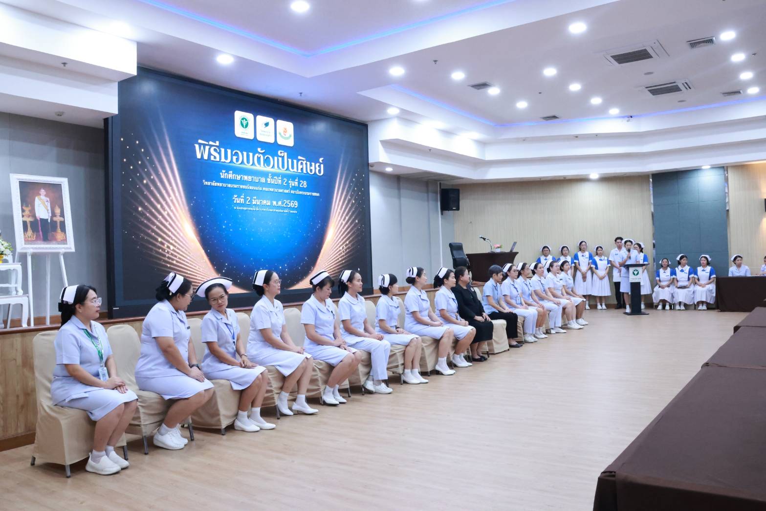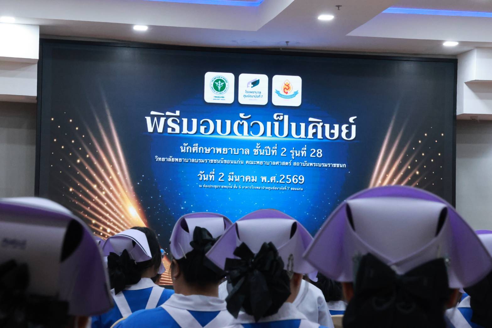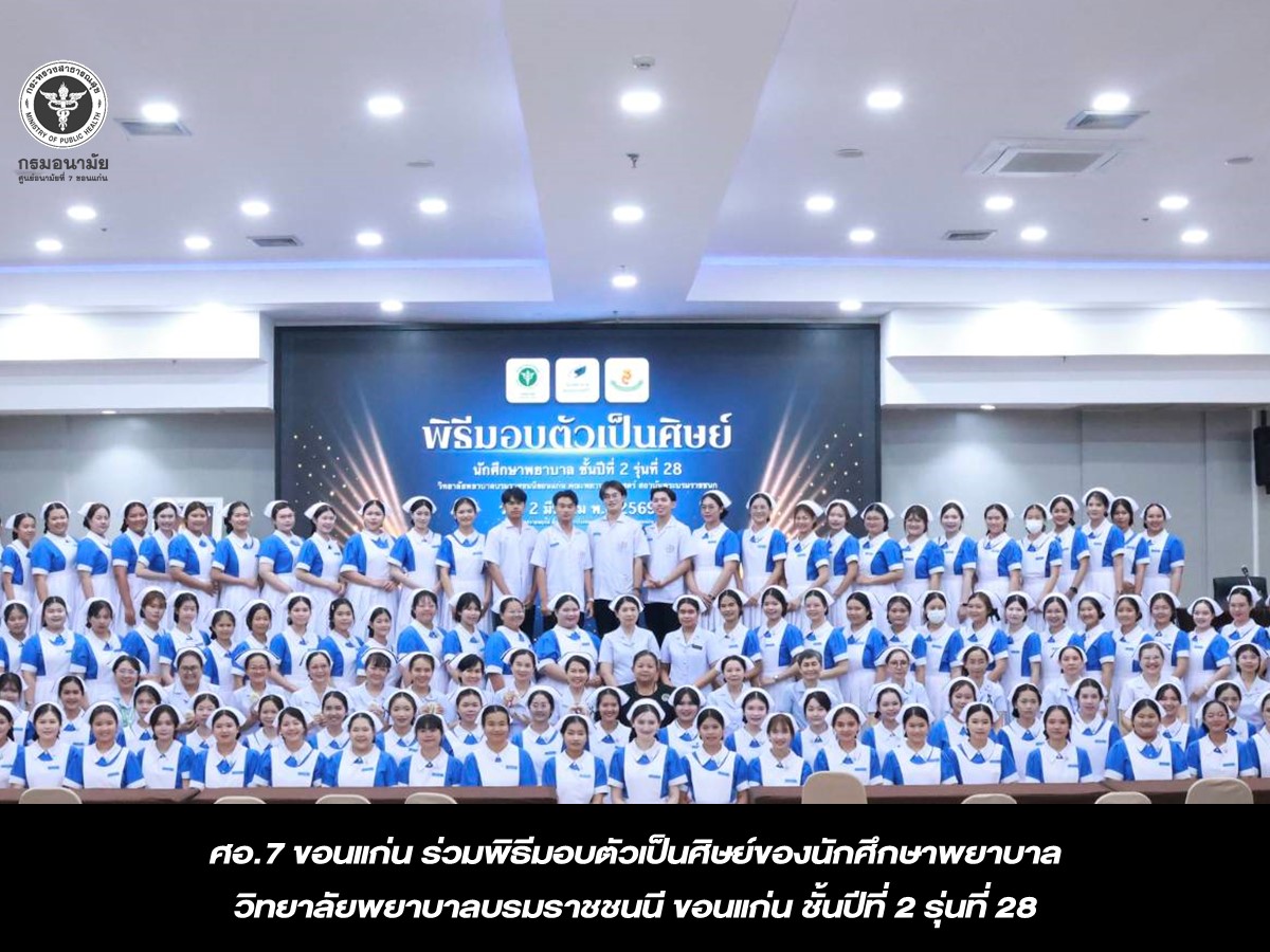 วันที่ 2 มีนาคม 2569 นพ.ชาตรี เมธาธราธิป ผู้อำนวยการศูนย์อนามัยที่ 7 ขอนแก่น มอบหมายให้ ดร.ปิยะนันท์ โพธิชัย หัวหน้ากลุ่มการพยาบาล และหัวหน้างาน โรงพยาบาลศูนย์อนามัยที่ 7 ขอนแก่น เข้าร่วมพิธีมอบตัวเป็นศิษย์ของนักศึกษาพยาบาล วิทยาลัยพยาบาลบรมราชชนนี ขอนแก่น ชั้นปีที่ 2 รุ่นที่ 28 ณ ห้องประชุมราชพฤกษ์ ชั้น 6 อาคารโรงพยาบาลศูนย์อนามัยที่ 7 ขอนแก่น โดยพิธีดังกล่าวจัดขึ้นเพื่อเสริมสร้างความสัมพันธ์ระหว่างนักศึกษา อาจารย์ และหน่วยฝึกปฏิบัติ ตลอดจนปลูกฝังคุณธรรม จริยธรรม และความเป็นวิชาชีพพยาบาลแก่นักศึกษา เพื่อเตรียมความพร้อมก่อนก้าวสู่การฝึกปฏิบัติงานในสถานบริการสุขภาพต่อไป