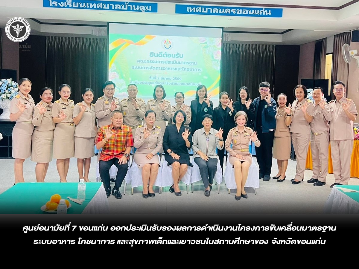วันที่ 2 และ 4-6 มีนาคม 2569 นายแพทย์ชาตรี เมธาธราธิป ผู้อำนวยการศูนย์อนามัยที่ 7 ขอนแก่น มอบหมายให้ นางบังอร กล่ำสุวรรณ์ รองผู้อำนวยการฯ และเจ้าหน้าที่กลุ่มพัฒนาการส่งเสริมสุขภาพวัยเรียน ร่วมกับสำนักงานกองทุนสนับสนุนการสร้างเสริมสุขภาพ (สสส.) และมูลนิธิสร้างเสริมวิถีบริโภคอาหารเพื่อสุขภาพ (มอส.) พร้อมด้วยทีมพี่เลี้ยงจากสำนักงานสาธารณสุขจังหวัดขอนแก่น สาธารณสุขอำเภออุบลรัตน์ อำเภอน้ำพอง โรงพยาบาลสมเด็จพระยุพราชกระนวน โรงพยาบาลส่งเสริมสุขภาพตำบลนาคำ ตำบลศรีสุขสำราญ อำเภออุบลรัตน์ โรงพยาบาลส่งเสริมสุขภาพตำบลหนองโน ตำบลหนองโอง อำเภอกระนวน โรงพยาบาลส่งเสริมสุขภาพตำบลบ้านท่ามะเดื่อ อำเภอน้ำพอง และต้นสังกัดสถานศึกษาจากสำนักงานเขตพื้นที่การศึกษาประถมศึกษาเขต 4 ลงพื้นที่ประเมินผลการดำเนินงานระบบการจัดการอาหารและโภชนาการในสถานศึกษา พร้อมติดตามความก้าวหน้าการดำเนินโครงการที่ทางโรงเรียนได้รับทุนสนับสนุนจาก สสส. โดยมีนางจงกลนี วิทยารุ่งเรืองศรี ประธานมูลนิธิสร้างเสริมวิถีบริโภคอาหารเพื่อสุขภาพ (มอส.) นายไพโรจน์ กระโจมทอง และเจ้าหน้าที่จากมูลนิธิฯ ลงพื้นที่ประเมินโรงเรียนในจังหวัดขอนแก่น จำนวน 7 แห่ง ได้แก่ โรงเรียนเทศบาลบ้านตูม โรงเรียนเทศบาลวัดกลาง อ.เมือง โรงเรียนหนองขามพิทยาคม โรงเรียนบ้านโคกกลางหนองไหลพิทยาสรรพ์ อ.อุบลรัตน์ โรงเรียนบ้านวังโพน โรงเรียนบ้านป่าติ้ว อ.กระนวน และโรงเรียนบ้านท่ามะเดื่อ อำเภอน้ำพอง