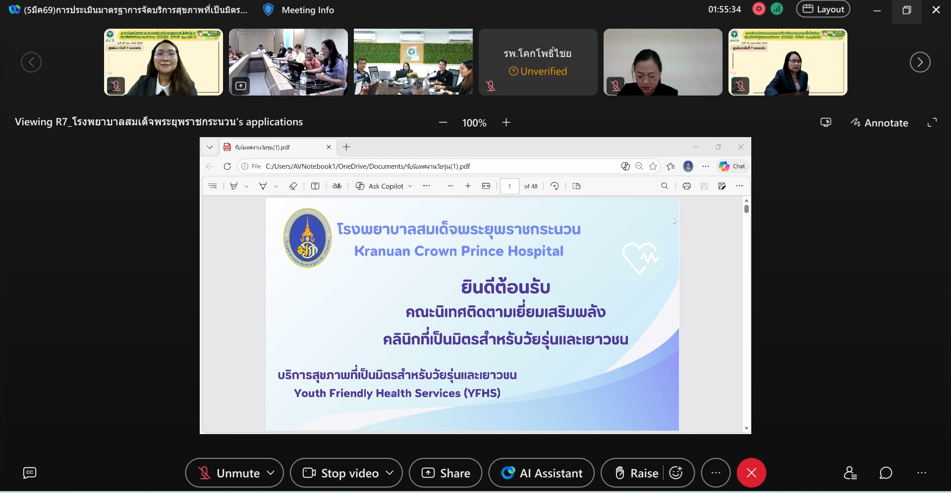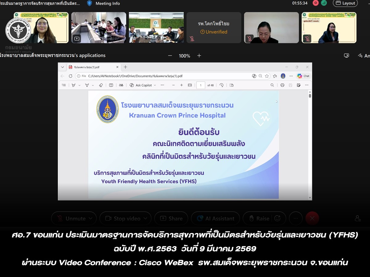 อ.7 ขอนแก่น ประเมินมาตรฐานการจัดบริการสุขภาพที่เป็นมิตรสำหรับวัยรุ่นและเยาวชน (YFHS) ฉบับปี พ.ศ.2563 ผ่านระบบ Video Conference : Cisco WeBex รพ.สมเด็จพระยุพราชกระนวน จ.ขอนแก่น