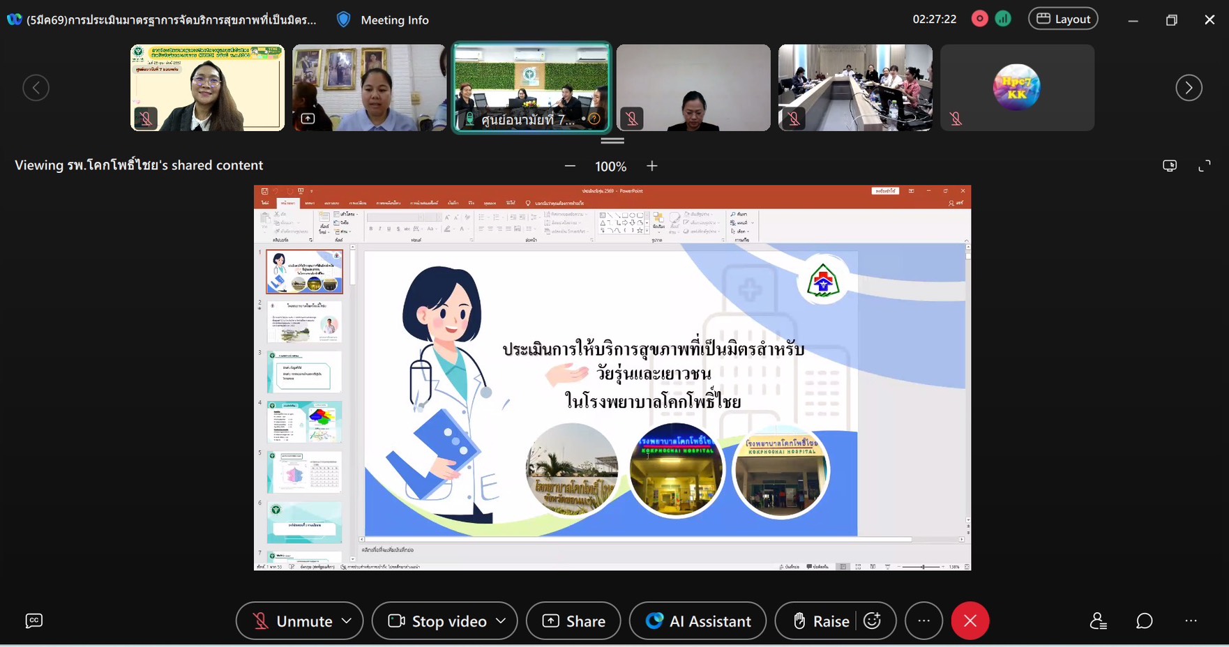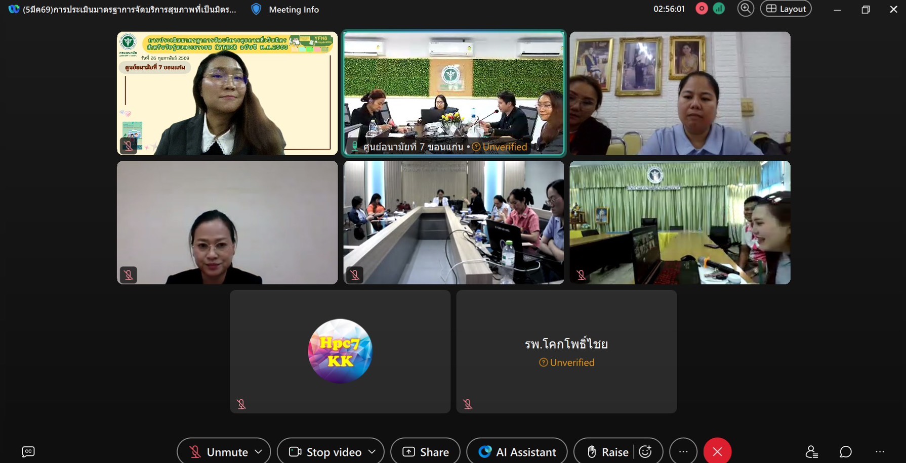 วันที่ 10 มีนาคม 2569 นางชนิตา รุ่งวิทยาการ หัวหน้ากลุ่มพัฒนาการส่งเสริมสุขภาพวัยรุ่น พร้อมคณะทีมประเมินจากศูนย์อนามัยที่ 7 ขอนแก่น ได้ดำเนินการประเมินมาตรฐานการจัดบริการสุขภาพที่เป็นมิตรสำหรับวัยรุ่นและเยาวชน (Youth-Friendly Health Services: YFHS) ของโรงพยาบาลโคกโพธิ์ไชย ผ่านระบบออนไลน์ (Video Conference : Cisco WeBex) ในการนี้ หัวหน้ากลุ่มพัฒนาการส่งเสริมสุขภาพวัยรุ่นได้กล่าวต้อนรับผู้เข้าร่วมการประเมิน แนะนำคณะทีมประเมิน และชี้แจงวัตถุประสงค์ของการประเมิน เพื่อสร้างความเข้าใจในกระบวนการและแนวทางการดำเนินงานตามมาตรฐานดังกล่าว จากนั้นโรงพยาบาลโคกโพธิ์ไชย ได้นำเสนอผลการดำเนินงานตามมาตรฐานการจัดบริการสุขภาพที่เป็นมิตรสำหรับวัยรุ่นและเยาวชน ให้คณะผู้ประเมินพิจารณาเป็นรายองค์ประกอบ ประกอบด้วยองค์ประกอบที่ 1 นโยบายและการบริหารจัดการองค์ประกอบที่ 2 ระบบบริการองค์ประกอบที่ 3 ชุมชนและภาคีเครือข่ายองค์ประกอบที่ 4 ระบบข้อมูลสารสนเทศ และองค์ประกอบที่ 5 ผลลัพธ์การดำเนินงาน การประเมินดังกล่าวมีวัตถุประสงค์เพื่อสร้างความเข้าใจร่วมกันเกี่ยวกับแนวทางการดำเนินงานตามมาตรฐานการจัดบริการสุขภาพที่เป็นมิตรสำหรับวัยรุ่นและเยาวชน อันจะนำไปสู่การพัฒนาคุณภาพบริการอย่างต่อเนื่อง และก่อให้เกิดประโยชน์สูงสุดต่อการส่งเสริมสุขภาพและการเข้าถึงบริการของวัยรุ่นและเยาวชน โดยมีการให้ข้อเสนอแนะเชิงพัฒนาร่วมกับสำนักงานสาธารณสุขจังหวัดขอนแก่น การประเมินในครั้งนี้มีผู้เข้าร่วมทั้งสิ้น จำนวน 10 คน