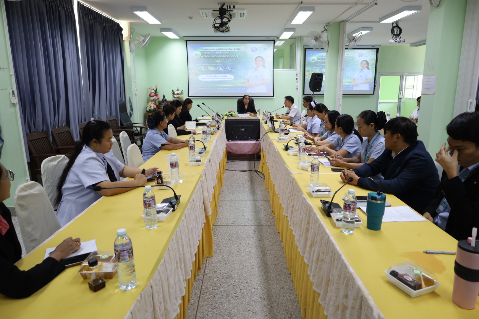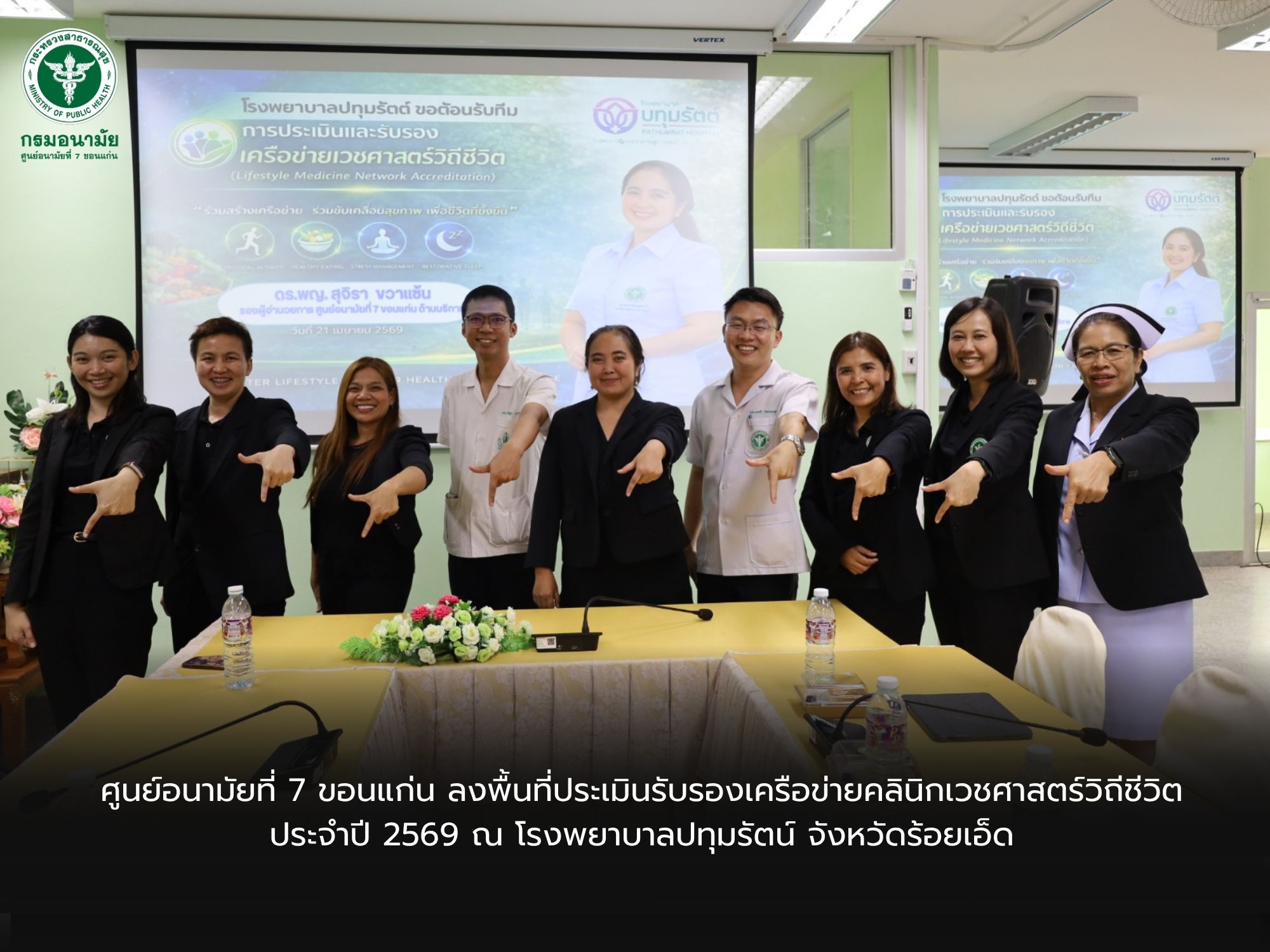 วันที่ 21 เมษายน 2569 นพ.ชาตรี เมธาธราธิป ผู้อำนวยการศูนย์อนามัยที่ 7 ขอนแก่น มอบหมายให้กลุ่มสื่อสารความรอบรู้ด้านสุขภาพและเวชศาสตร์วิถีชีวิต ดำเนินการตรวจประเมินรับรองเครือข่ายคลินิกเวชศาสตร์วิถีชีวิต กรมอนามัย ประจำปี 2569 ณ โรงพยาบาลปทุมรัตน์ ซึ่งเป็นโรงพยาบาลชุมชน ครอบคลุมพื้นที่ 8 ตำบล 101 หมู่บ้าน ประชากร 51,239 คน โดยมี ดร.พญ.สุจิรา ขวาแซ้น รองผู้อำนวยการฯ (ด้านบริการ) เป็นประธานคณะกรรมการตรวจรับรองฯ